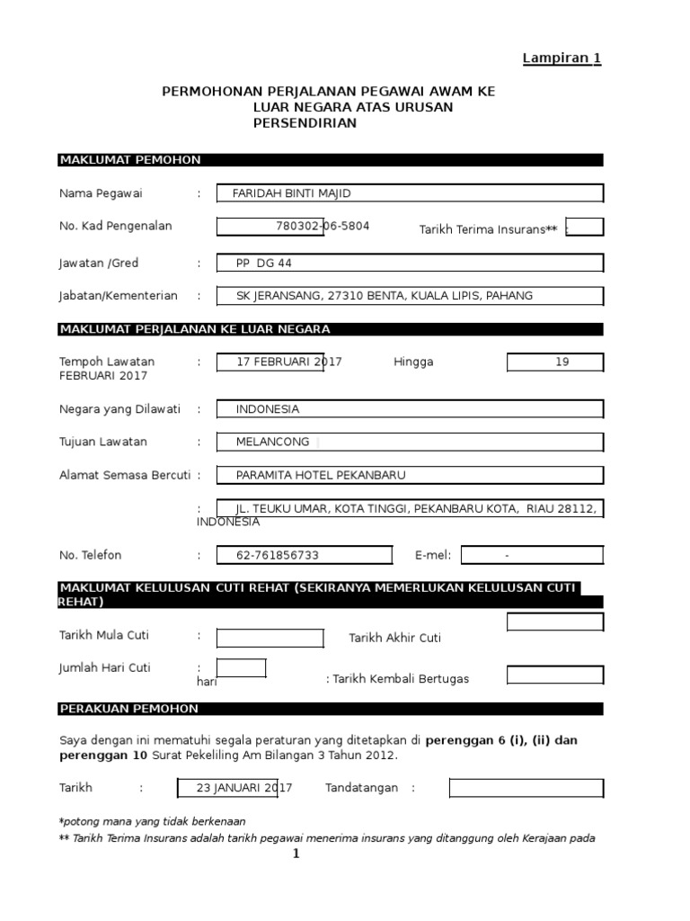Borang menghadiri persidangan, seminar dan lawatan rasmi ke luar negara. Borang permohonan kebenaran keluar 4 jam. Doc 661739357 borang permohonan perjalanan ke luar negara lampiran 1 1 zakwan wan academia edu. Anda perlu memiliki insuran perjalanan apabila anda berniat untuk keluar negara. Klik butang cetak untuk mencetak borang permohonan bpn yang telah didaftarkan. Perjalanan dinas ke negara yang belum memiliki hubungan diplomatik dengan indonesia, diperlukan rekomendasi dari departemen luar negeri. Bayaran penuh dalam ringgit malaysia (rm) akan di kredit ke dalam akaun anda jika anda ada. * borang ini perlu diisi untuk pegawai yang sering berulang alik ke luar negara jiran yang bersempadanan dengan. Permohonan dihantar ke kppm untuk sokongan. Sebelum bercuti atau melancong ke luar negara banyak yang perlu di lakukan. Permohonan disemak dan sebarang pembetulan akan dimaklumkan melalui emel dan / atau telefon. Untuk makluman, permohonan pengundian pos luar negara pru14 akan dibuka bermula hari selasa, 23 januari 2018. 1 lampiran 1 permohonan perjalanan pegawai awam ke luar negara atas urusan persendirian maklumat pemohon nama pegawai :