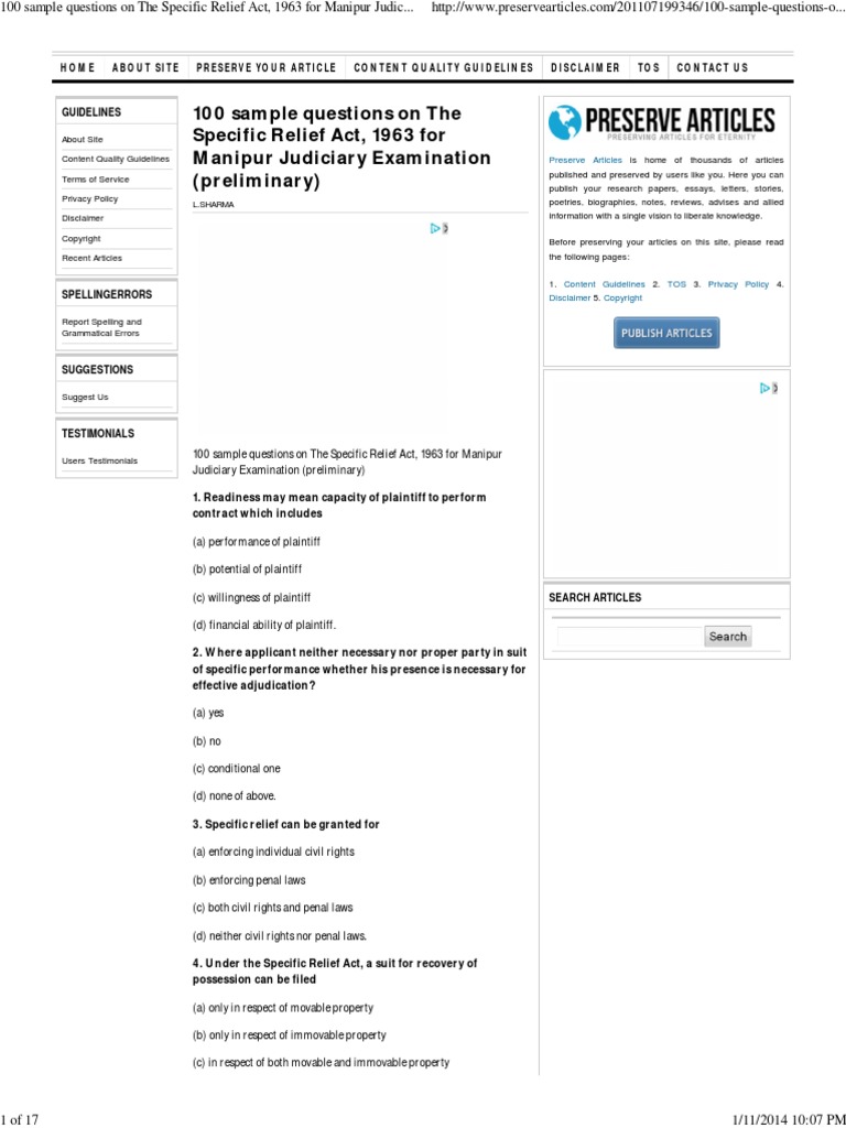 Specific Relief ActSpecific Relief Act | Specific ... from imgv2-2-f.scribdassets.com It replaced an earlier act of 1877. And it shall come into force on the first day of may, 1877. Specific performance what is sp when sp cannot be granted when sp may be granted in malaysia, specific performance and injunction are forms of what is termed specific relief. Short title, extent and commencement.—(1) this act may be called the specific relief act, 1963. The indian contract act, 1872 1.5. However, few studies suggest that legislation on specific. Enforceable by law becomes void when it ceases to be enforceable. specific relief is embodied in a statute entitled the specific relief act 1950: