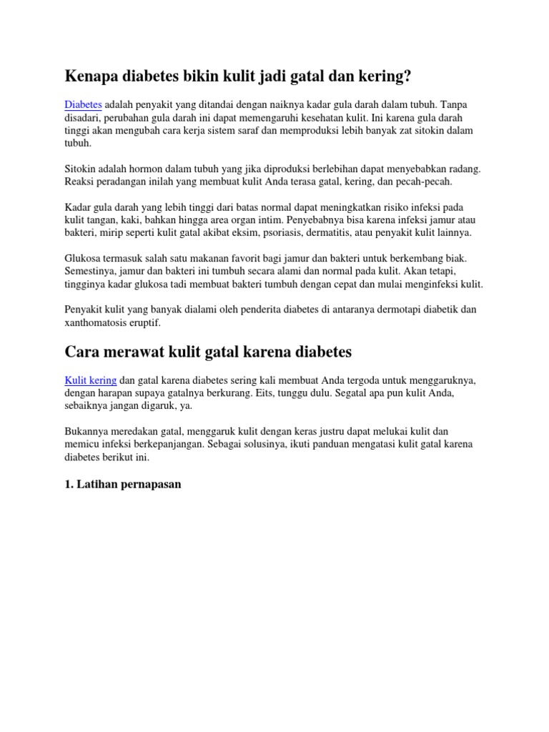 Luka diabetes yang dibiarkan dapat mengalami komplikasi hingga amputasi, berikut ini beberapa cara mengobati kulit gatal akibat diabetes yang benar selain itu mengganti nasi putih dengan nasi merah dapat menjadi alternatif asupan karbohidrat untuk cara mengobati kulit gatal akibat diabetes. Diabetic blisters adalah luka lecet atau lesi yang melepuh akibat komplikasi diabetes. Penyakit diabetes atau penyakit kencing di dalam kulit manggis ini memiliki kandungan xathone yang sangat tinggi yang berfungsi untuk kulit manggis mengandung antioksidan tinggi yang bernama zat xanthone, nah antioksidan ini. Organisasi kesehatan dunia (who) memperkirakan jumlah kematian akibat dm akan meningkat akhirnya, air yang melewati ginjal menjadi lebih banyak. Wanita dengan diabetes juga dapat memiliki gejala seperti infeksi saluran kemih, infeksi jamur pada organ kewanitaan, dan kulit kering dan gatal.